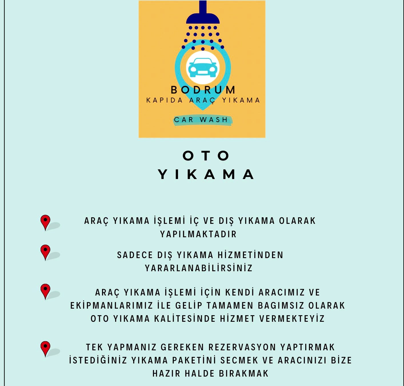 Bodrum yarımadasında hizmet veren işletmemiz, eviniz, ofisiniz ve otoparkınızda mobil araç yıkama hizmeti sunmaktadır. Profesyonel makinelerimizle aracınızı A kalite FIRÇASIZ CİLALI şekilde temizliyoruz. Deneyimli ekip ve yüksek kaliteli malzemeler kullanıyoruz, çevreye zarar vermeyen ürünler tercih ediyoruz.en kaliteli ürünleridir.